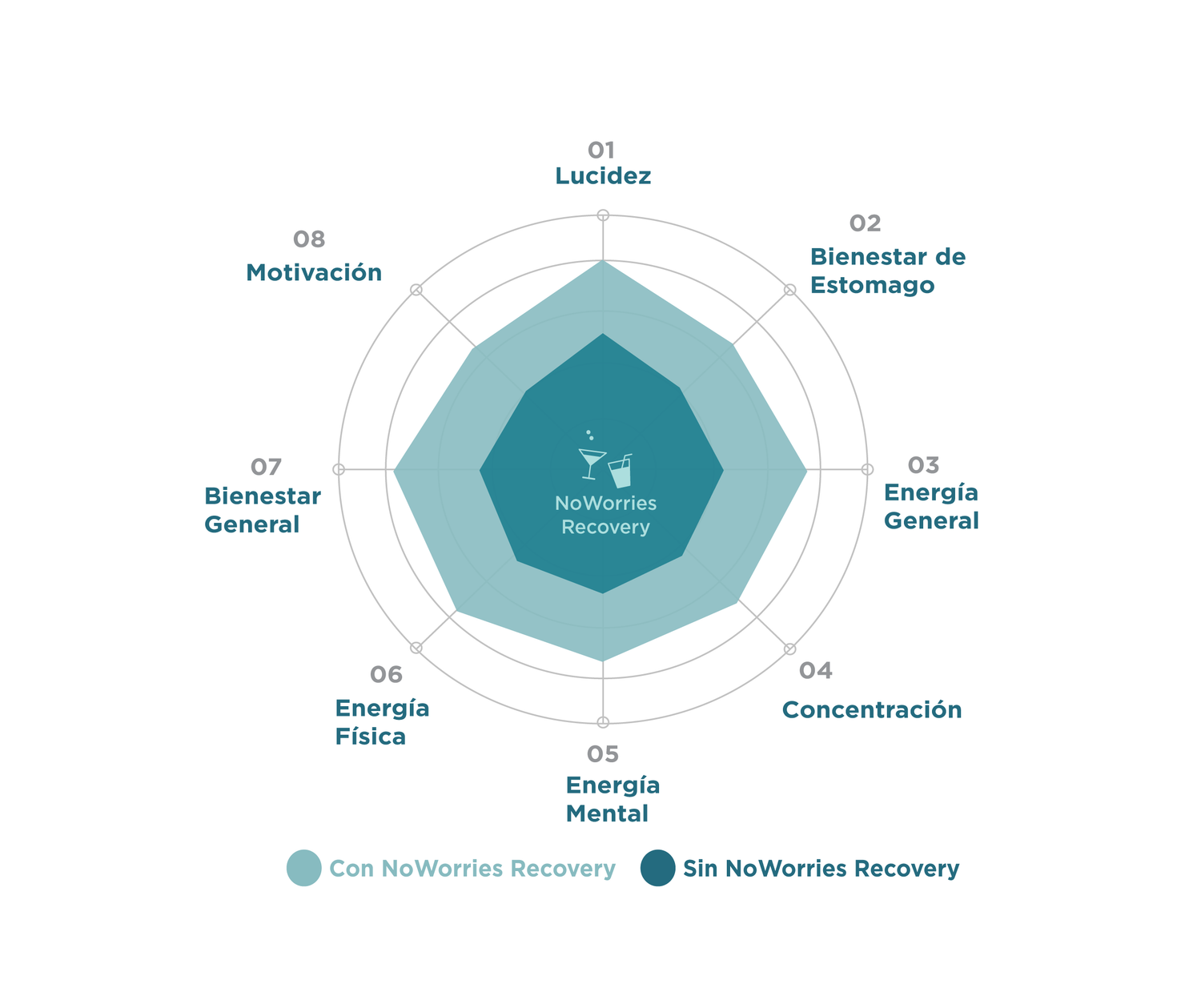 I nostri utenti di NoWorries Recovery riscontrano un miglioramento medio del 50% o più il giorno successivo in 8 effetti tipici. Svegliati sentendoti meglio del 50% o sarai rimborsato!